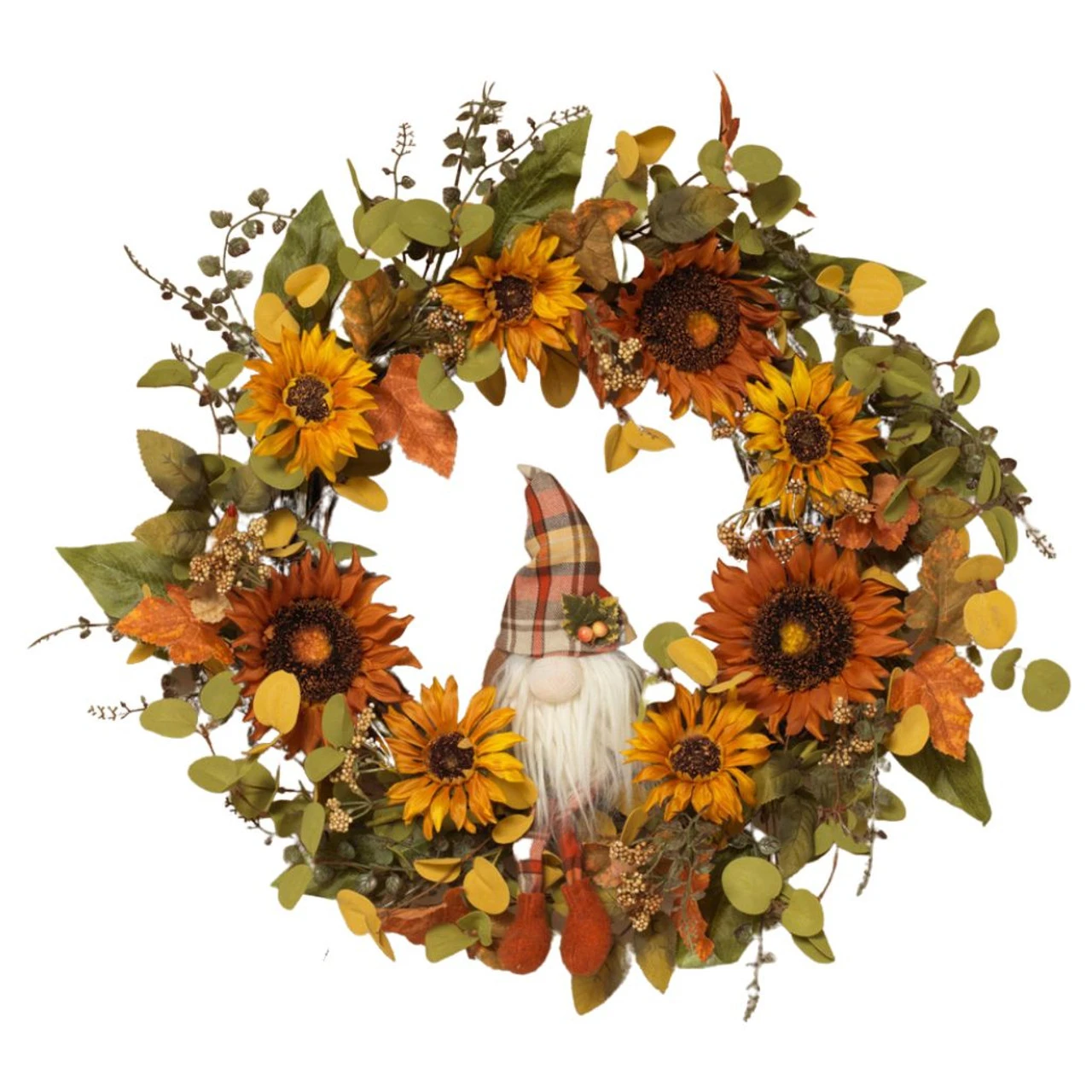 Designed for fall, hang it wherever you need a fall color to decorate your space. Full of sunflowers, leaves, and a friendly Gnome sitting at the bottom
