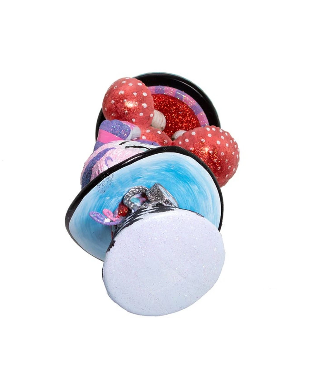 Hollywood™ Nutcrackers is a whimsical collection of nutcrackers created exclusively for Kurt S. Adler, Inc. and features an assortment of designs that put a unique, vibrant, memorable twist on traditional nutcrackers. This Cheshire Cat nutcracker is featured sitting atop a glittered mushroom forest base, complete with glittered top hat and watch.