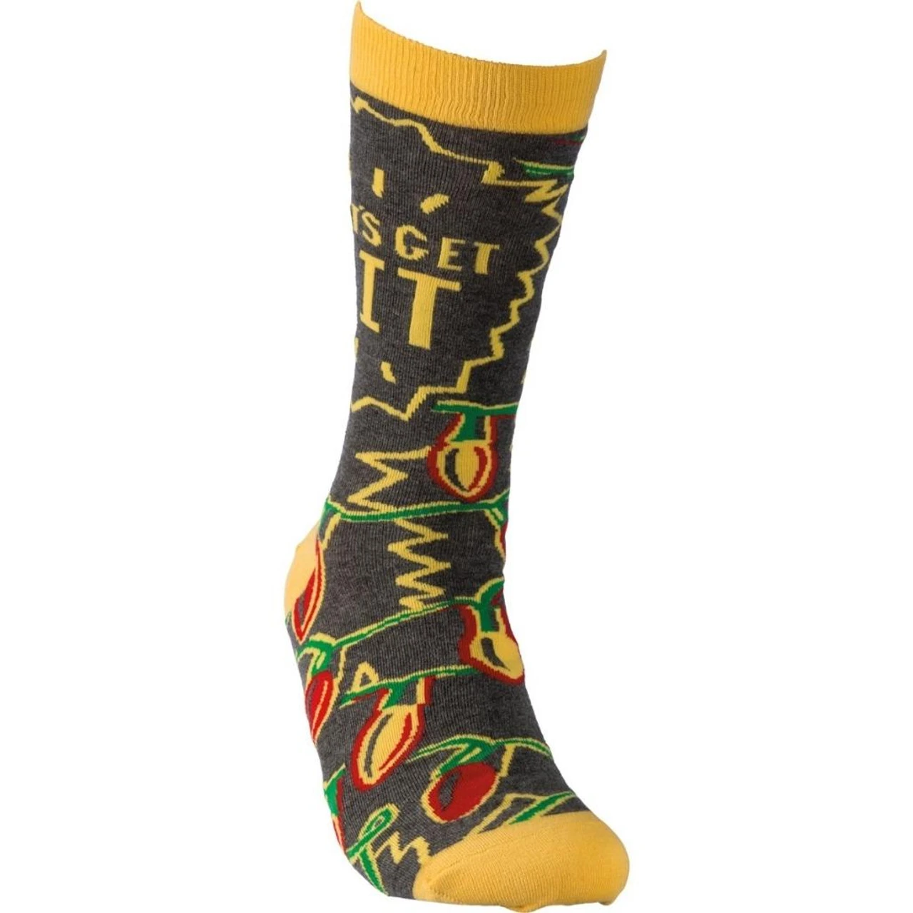 These colorful socks feature woven designs with a coordinating “Let’s Get Lit” sentiment. Cotton, nylon, spandex. One size fits most.